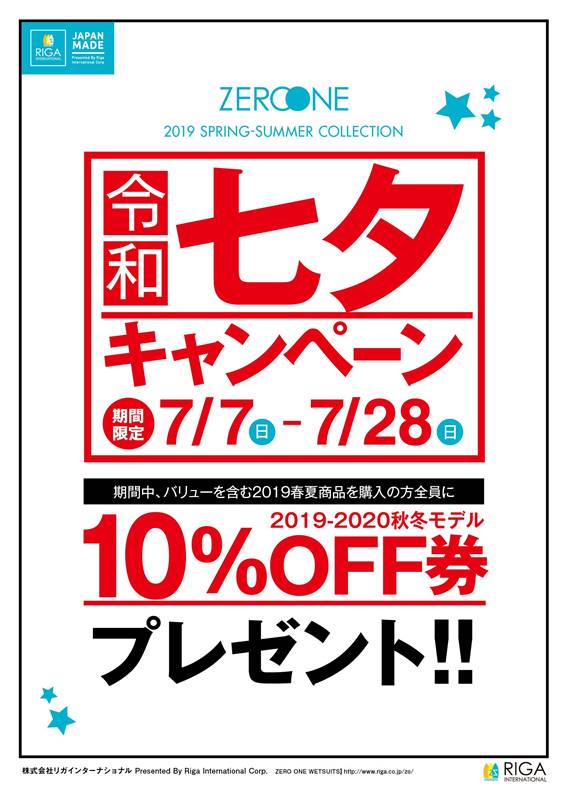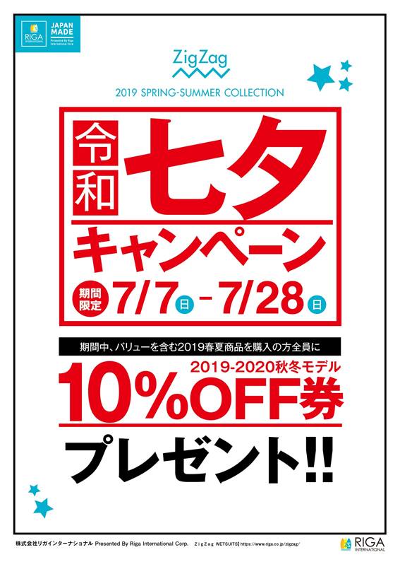 2019ZERO ONE&ZigZagのバリューモデルを含む春夏全商品を購入の方全員に、2019~2020秋冬モデル10%OFFの短冊型チケットをプレゼント致します!期間は、7月7日~7月28日まで!星に願いを唱えるといつか叶う☆彡ということで、夏物を頼むと秋冬物の値引が叶います!たくさんの方の願いが叶ってほしので、是非ご検討下さいね。